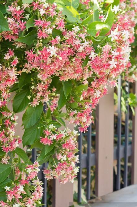 - نبات رانجون المتسلق (المعروف أيضًا باسم Quisqualis Indica، وعلميًا باسم Combretum indicum)، نباتٌ دائم الخضرة سريع النمو، قادر على التسلق حتى ارتفاع 21.2 مترًا عند توفر دعامة كافية. يشتهر هذا النبات بأزهاره البيضاء الزاهية، ذات الرائحة العطرة. تنبت هذه الأزهار في عناقيد متدلية، بيضاء اللون عند فتحها، ثم تتحول إلى اللون الوردي والأحمر، ثم إلى اللون الكستنائي الداكن. مع هذه الأزهار الجميلة، ينمو نبات رانجون المتسلق بقوة ويتسلق أيضًا. يزهر طوال فصل الصيف، مما يجعله نباتًا صيفيًا ممتازًا. مع نضجه، يتحول ساقه إلى مظهر خشبي وشائك. يُزرع على نطاق واسع لتغطية الأسوار والجدران وأي دعامات زخرفية أخرى في الهواء الطلق.