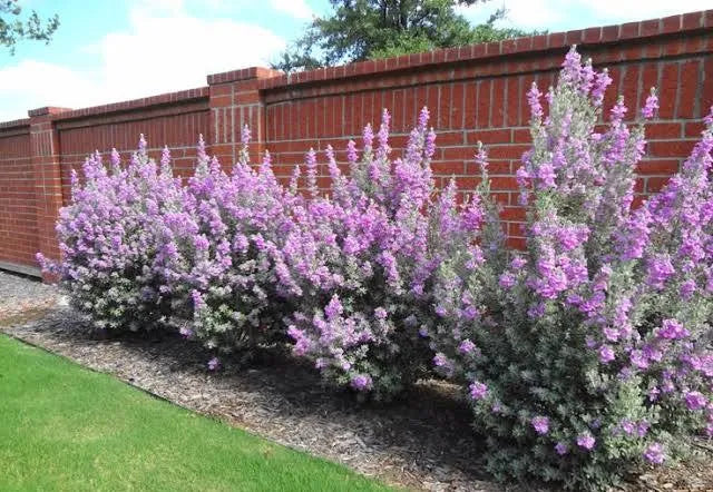 - نبات المريمية تكساس (Leucophyllum Frutescens) شجيرة دائمة الخضرة، يصل ارتفاعها إلى 150-240 سم، ذات شكل دائري كثيف. تشتهر هذه الشجيرات بأوراقها الفضية الناعمة الملمس، وأزهارها الوردية البنفسجية الجرسية التي تنبثق من محورها، خاصةً خلال نهار الصيف أو الخريف. تتميز نباتات المريمية تكساس بأزهارها المميزة، حيث تزهر عادةً لبضعة أيام خلال الصيف أو الخريف، ويعتمد ذلك أيضًا على هطول الأمطار. كما تُعتبر أزهارها عامل جذب رئيسي للفراشات والنحل. كما أن أوراقها ذات الملمس الناعم تجعلها تحوطًا جيدًا، أو نباتًا أساسيًا، أو نباتًا مميزًا. يسهل تقليمها، وبالتالي يمكن زراعتها في حدود الشجيرات، أو حتى مع النباتات المعمرة والحولية.