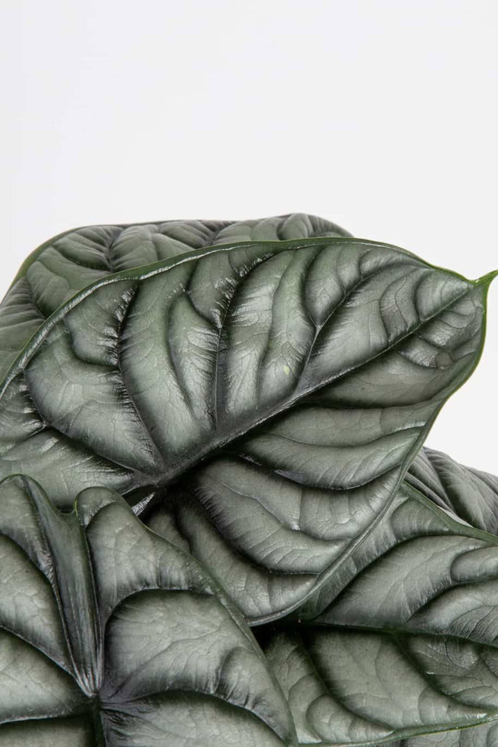 Alocasia 'Dragon Scale' is a beautiful plant rarity that you can't take your eyes off of. Its delightful sagittal leaves are deceptively similar to the scales of some reptiles, and this resemblance is inspired by its variety name - Dragon Scale. The leaves are hard and leathery to the touch, and the blade is deeply carved with veins, creating a three-dimensional effect. In addition to the impressive texture, the leaves delight with an amazing green-gray color of varying intensity. The veins are clearly grooved and dark green in color, which creates a beautiful pattern on the leaf blade. There are lighter, greenish-gray contrasting spots between the dark lines of the nerves. The underside of the leaf is lighter in color and decorated with red veins. Alocasia 'Dragon Scale' grows moderately fast and grows up to 50 cm in height and similar width. It blooms with a small cola-like inflorescence, typical of picture plants. It works perfectly as a decoration for modern interiors, small rooms or as an ornament for a shelf or bookcase.