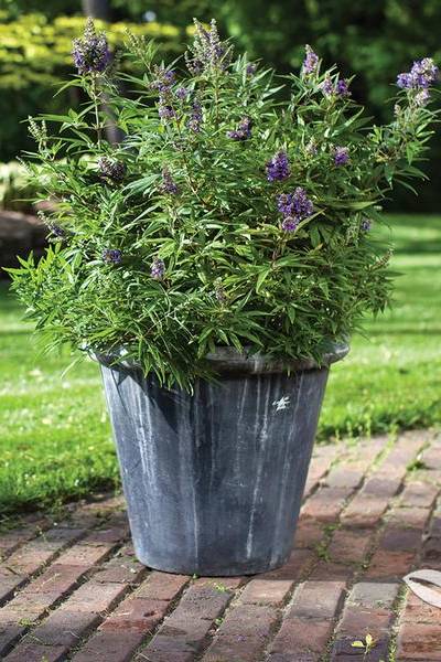 A healthy Chaste Tree (Vitex Agnus Castus) plant in a pot, ideal for outdoor planting.
