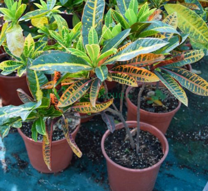 Codiaeum variegatum Upright, woody-based perennial with thick, ovate to linear, leathery leaves to 30cm long, often deeply lobed, in various colours, usually green and yellow when young, maturing to shades of red. White flowers, 5mm across, are borne in summer. Height 1-2m, Spread 0.6-1.5m. Deliverable