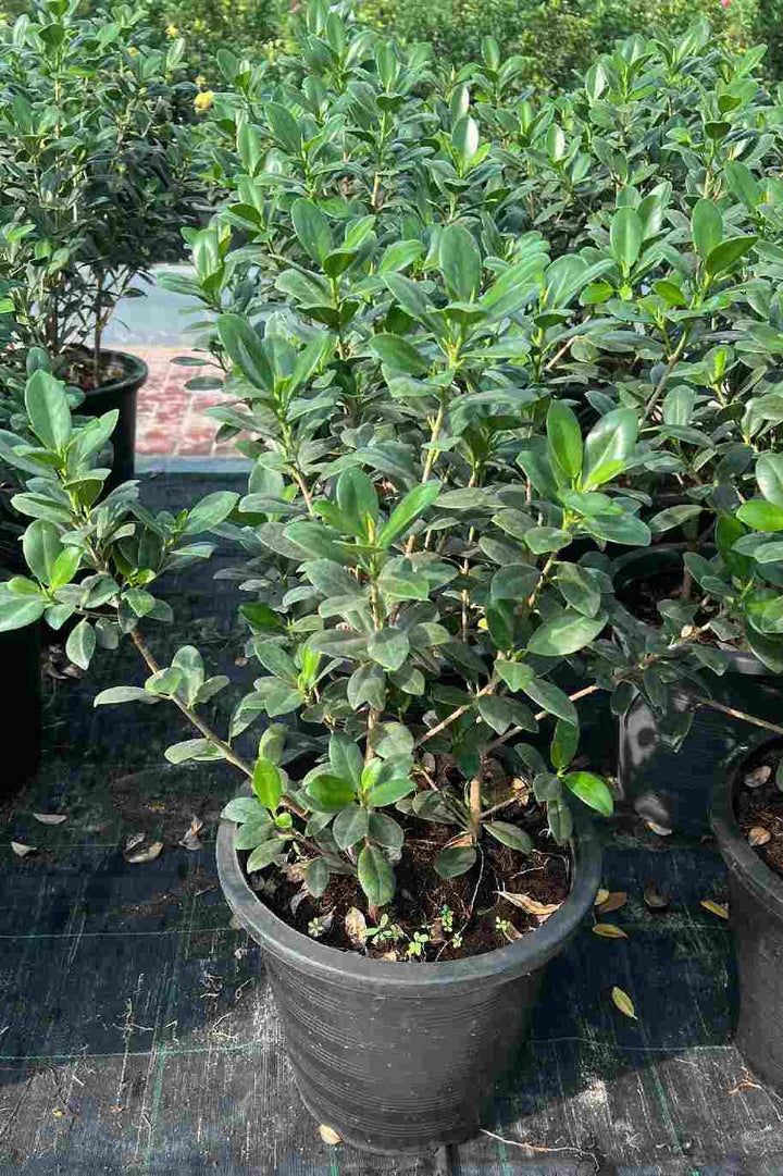 Ficus microcarpa Green Island (Chinese Banyan) leaves are little longer than wide, say three to four inches in either dimension, and the shape would be described botanically as orbicular with only an obscure tip These leaf differences are pretty constant, but even more significant is the growth habit. Green Island tends to spread out sideways and is easy to train as a ground-hugging shrub clinging closely to rocks, across a bed, or even trailing down a wall.