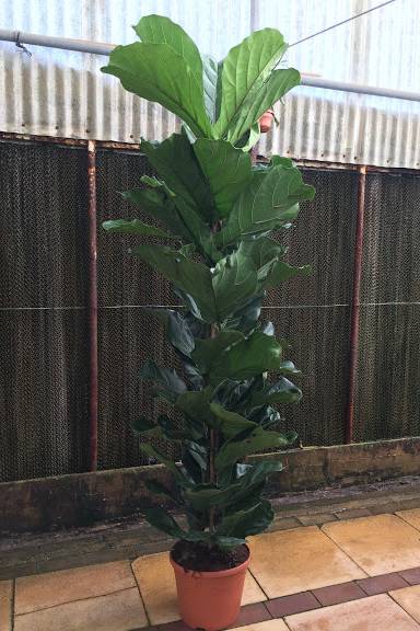 The Fiddle Leaf Fig appreciates a warm, humid environment, a fair amount of water and plenty of light. Choose a location away from air vents and drafts where the tree will receive plenty of bright ambient light. The Fiddle Leaf Fig likes its soil to be kept consistently evenly moist, with a brief drying out period between waterings, as it comes from an area of the world that gets very dry between rain. Water it thoroughly whenever the top 2” of soil have dried. Allowing the soil to dry more than a few inches will lead to leaf loss, so be sure to check in with the soil regularly until you develop a routine with your plant. In contrast, too much moisture in the soil can lead to root rot and also cause leaves to drop. Rotate your tree once a month to keep it standing straight and tall. Fiddle Leaf Figs, in particular, like to reach towards the light, so if you don’t rotate you’ll notice them bending over time.