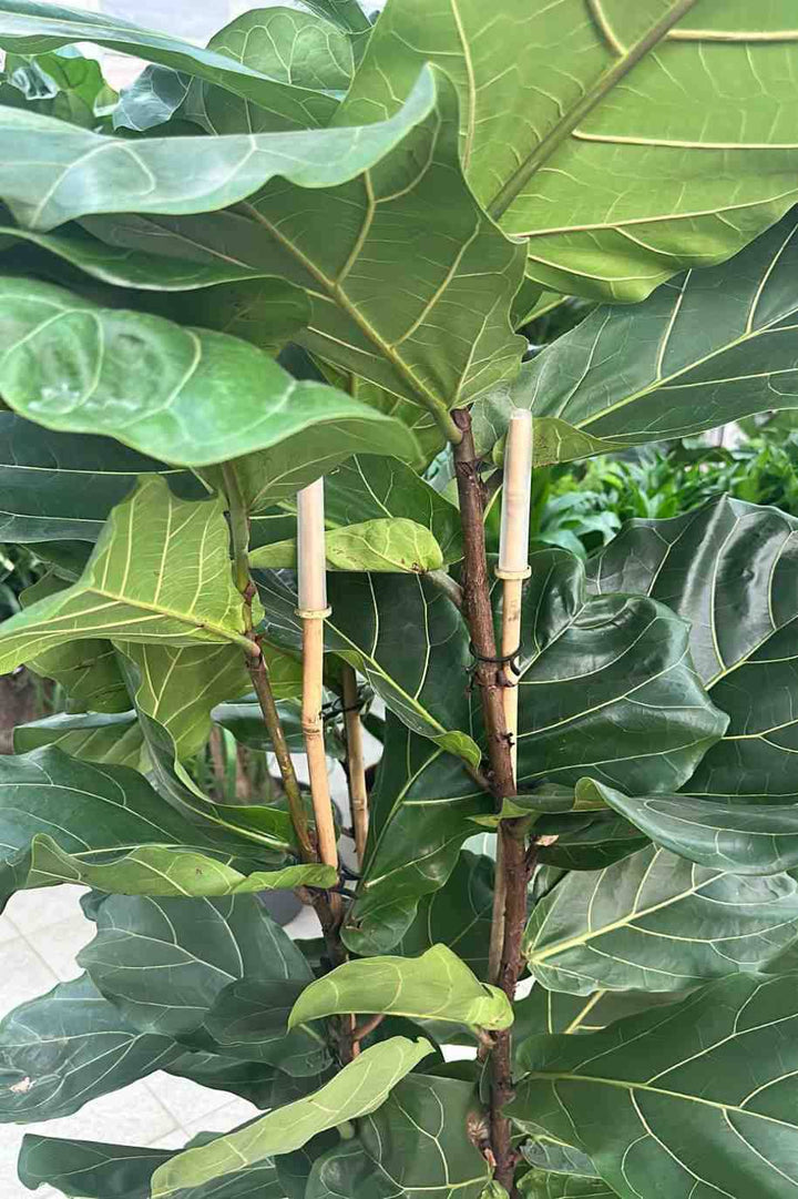 The Fiddle Leaf Fig appreciates a warm, humid environment, a fair amount of water and plenty of light. Choose a location away from air vents and drafts where the tree will receive plenty of bright ambient light. The Fiddle Leaf Fig likes its soil to be kept consistently evenly moist, with a brief drying out period between waterings, as it comes from an area of the world that gets very dry between rain. Water it thoroughly whenever the top 2” of soil have dried. Allowing the soil to dry more than a few inches will lead to leaf loss, so be sure to check in with the soil regularly until you develop a routine with your plant. In contrast, too much moisture in the soil can lead to root rot and also cause leaves to drop. Rotate your tree once a month to keep it standing straight and tall. Fiddle Leaf Figs, in particular, like to reach towards the light, so if you don’t rotate you’ll notice them bending over time.