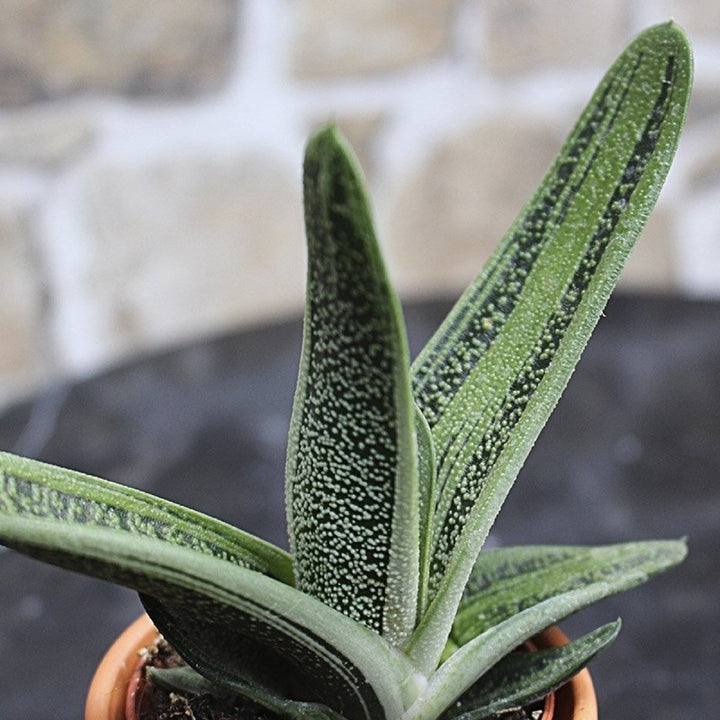 Gasteria is a genus of succulent plants, native to South Africa (and the far south-west corner of Namibia). Gasterias are recognizable from their thick, hard, succulent “tongue-shaped” leaves. Their inflorescence is also unique, with their curved, stomach-shaped flowers, which hang from inclined racemes. The genus is native to South Africa, where it grows in lightly shaded conditions with excellent drainage. As a result, the plant tolerates lower light conditions than most other well-known succulents, making them very good houseplants.