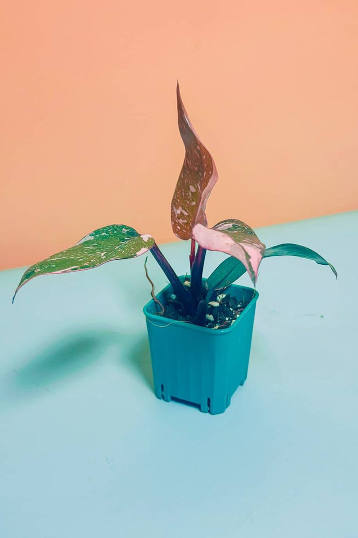 A hugely popular philodendron, with its bold dark green-burgundy leaves with large splashes and speckles of bright pink. It is a stand out plant, especially as it matures and the leaves grow larger. New leaves emerge a dark olive-green, maturing to a dark burgundy-green with pink tones. The pink princess is a natural climber, and needs a trellis, stake or moss pole to climb up, which also encourages large, healthy new leaves. Develops best pink colouring in bright indirect light. Requires a free draining mix. Allow surface to dry between watering, keep a little on the drier side in the winter.