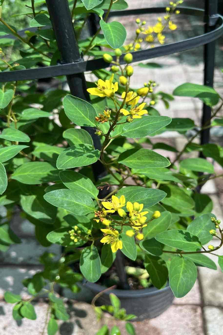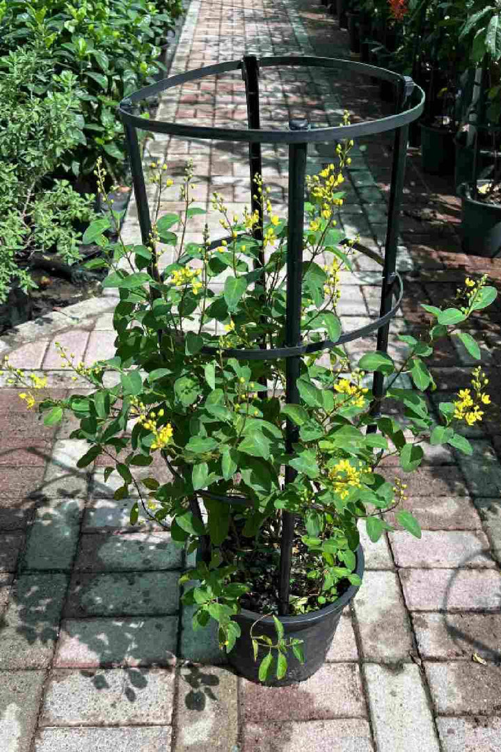 Thryallis is a large, evergreen shrub. The leaves are opposite on the stems, light green to bluish, smooth or waxy and elliptical to oval-shaped with two visible glands at the base. The stems are reddish with many hairs. The yellow flowers are borne on terminal racemes, or un-branched flower stalks. The shrubs bear some flowers year round with a heavier bloom in summer. The flower petals do not drop completely and interesting three part seed capsules grow above them.