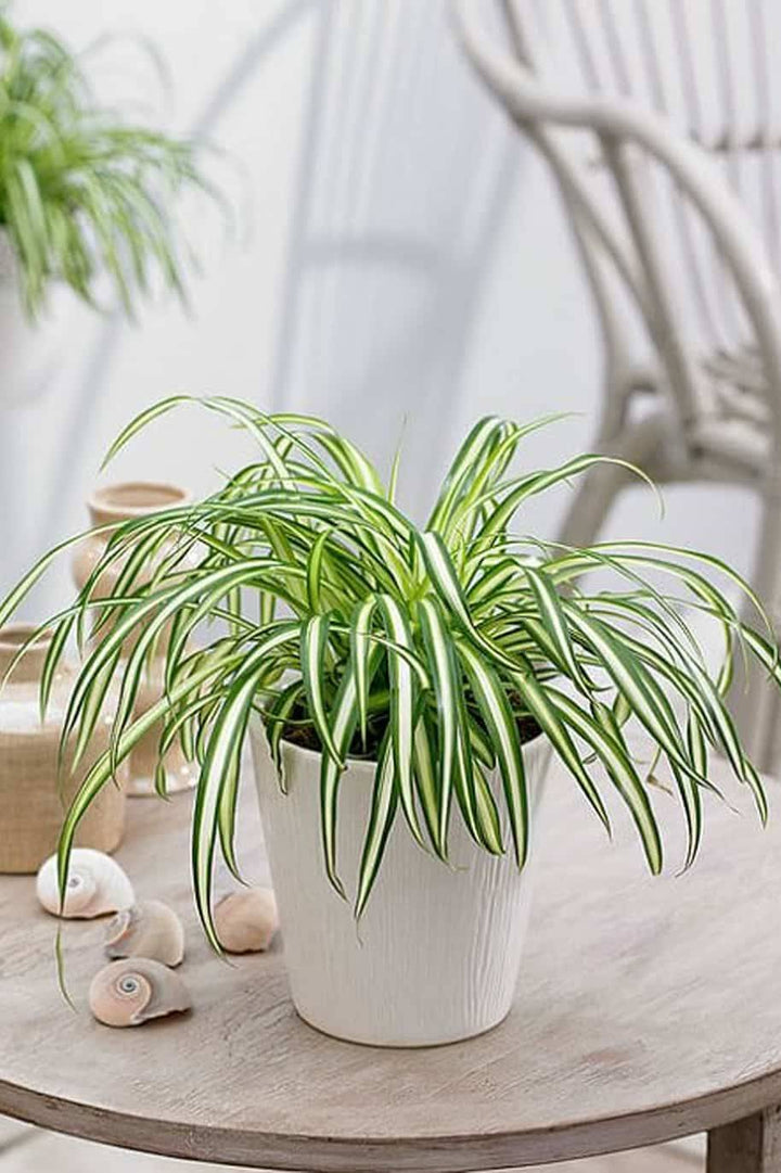Chlorophytum comosum, often called spider plant or airplane plant,] is a flowering perennial herb. Spider Plant is an impressive house plant for beginners. It’s easy to care for, tolerates average room conditions, and is easy to propagate.The slender, arching leaves are dark green with a creamy white stripe. Leaves grow from a central crown and can reach up to 1 ft (30 cm) long. Give this plant plenty of light for the best leaf color.