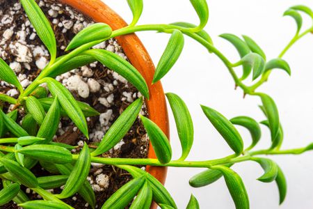 This popular trailing succulent has leaves that are shaped like bananas or fish hooks, and if grow in the ground instead of in a hanging garden, “String of Bananas” can trail along the ground. When cared for properly, this succulent grows quickly, and is easily propagated.