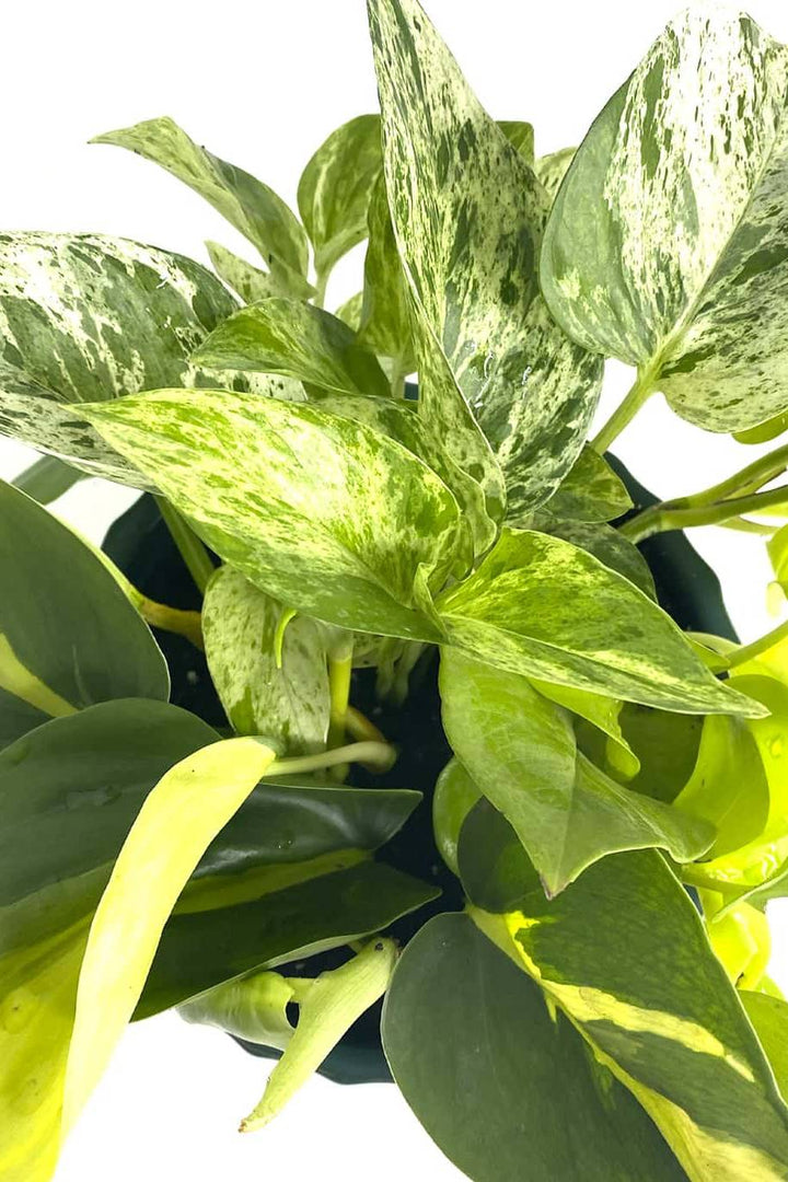 Golden Pothos (Scindapsus aureus) plants are among the most popular houseplants for their versatility and easy care. Golden Pothos have a yellow and green variegation which make them easily recognizable and popular in a variety of settings. Also known as Devil’s Ivy, Golden Pothos is naturally found in forests from Southeast Asia to the West Pacific. Typically a fast-growing strong climber, Golden Pothos can flourish as houseplants or climbers, indoor and outdoor, in full sun or partial shade, and requires little watering.